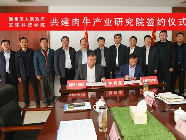 陈丰、闪健分别代表校地双方签署《ky开云官方网站_ky开云(中国)股份有限公司, 潘集区人民政府共建肉牛产业研究院合作协议》。