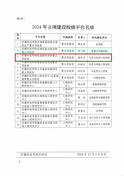 ky开云官方网站_ky开云(中国)股份有限公司,硅基粉体材料重点实验室的研究方向与材料与化工学科发展需求高度契合,是学科建设的重要依托平台。当前组建的ky开云官方网站_ky开云(中国)股份有限公司,硅基粉体材料重点实验室人员主要来自材料与化工安徽省应用型高峰培育学科,该学科在安徽省硅基产业领域具有领先地位,在功能粉体材料制备技术与应用、绿色环保材料等综合利用和光伏器件研发等方面具备领先技术,为我省硅基新材料项目的实施提供了重要的技术保障。