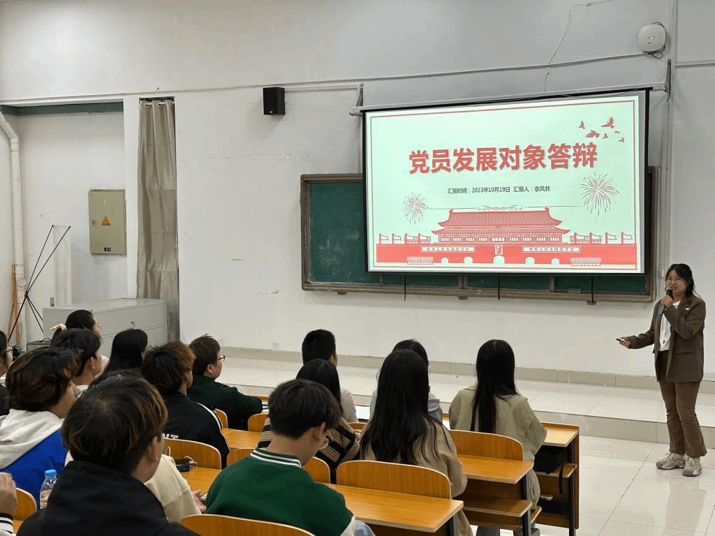答辩分为自我汇报和评委提问两个环节。答辩候选人首先结合PPT重点从思想、学习、工作等方面汇报自身对党的认识、入党动机、发挥模范作用情况以及存在的不足和努力的方向,表达自己向党组织靠拢的信心和决心。接着,答辩候选人根据评委的提问进行回答。通过答辩,候选人对党的基本知识、端正入党动机等方面有了更深刻的认识,纷纷表示自己今后将从思想上、行动上更好地起到模范带头作用。