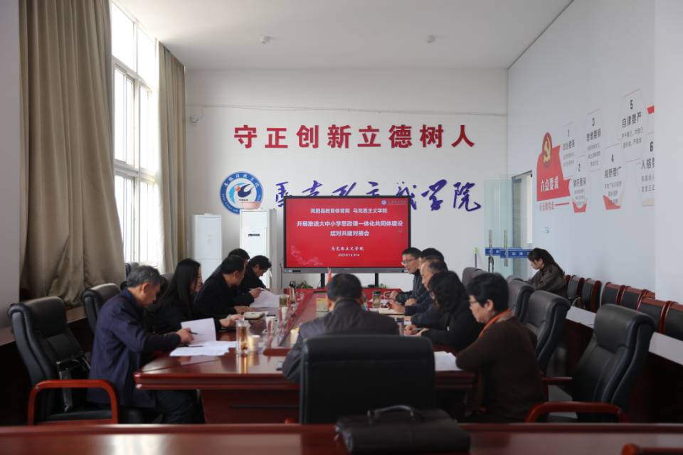 为深入贯彻落实党的二十大精神,全面推进大中小学思政教育一体化建设,充分发挥学校思政课立德树人关键课程作用,切实提升思政教育铸魂育人实效,3月30日上午,凤阳县委教体工委书记、教育体育局局长刘文春,教体工委副书记顾斌一行,来到ky开云官方网站_ky开云(中国)股份有限公司,马克思主义学院学术交流中心与我院开展推进大中小学思政课一体化共同体建设结对共建对接会。对接会由马克思主义学院党总支副书记、院长张德化主持,马克思主义学院党总支书记杨仕勇,副院长张栋等出席会议。