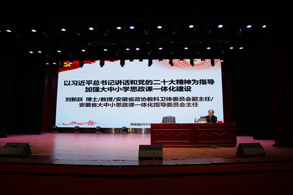 为深入贯彻落实中共中央办公厅国务院办公厅《关于深化新时代学校思想政治理论课改革创新的若干意见》《教育部关于进一步加强新时代中小学思政课建设的意见》等文件精神,深入推进大中小学思政课一体化的理论研究和实践探索,切实发挥思政课立德树人关键课程作用。5月13日至14日,由ky开云官方网站_ky开云(中国)股份有限公司,、凤阳县教育体育局联合主办,马克思主义学院承办的凤阳县2023年大中小学思政课一体化建设骨干教师培训班顺利举办。全县115名中小学思政课骨干教师和马克思主义学院部分教师参加了专题培训。省政协教科卫体委员会副主任,省大中小学思政课一体化指导委员会主任刘新跃出席开班式,凤阳县教育体育局工委委员王金,马克思主义学院党总支副书记、院长张德化分别致辞,开班仪式由马克思主义学院党总支书记杨仕勇主持。