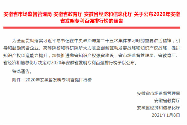据悉,安徽省发明专利百强排行榜发布旨在为全面贯彻落实习近平总书记在中央政治局第二十五次集体学习时的重要讲话精神,引导和鼓励我省企业、高等院校和科研院所大力实施创新驱动发展战略和知识产权战略,促进知识产权创造能力提升,加快推进我省知识产权强省建设。评选综合考量参选主体的创新能力、知识产权的运用与管理能力等。(特约通讯员:常蕊 审核:肖新)