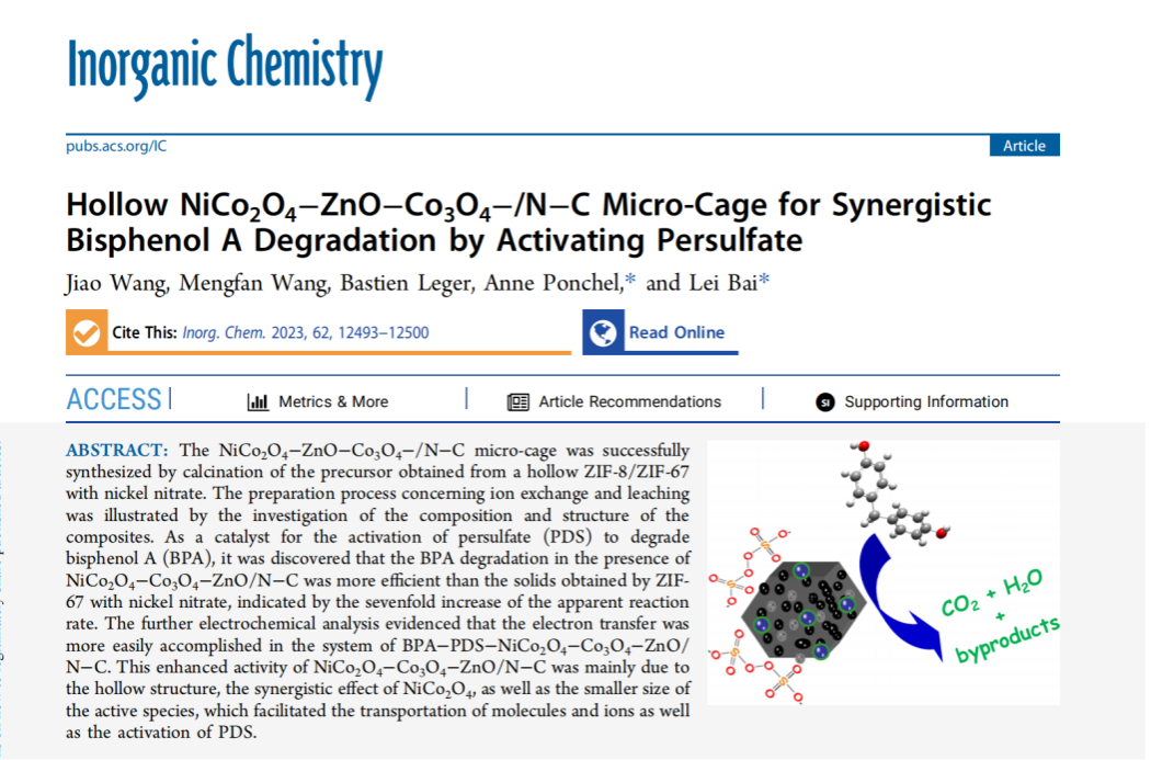ky开云官方网站_ky开云(中国)股份有限公司,食品科学与工程学院食品安全及控制团队教师融合食品科学、化学科学与环境科学,采用钴酸镍-钴氧化物复合材料,利用组分和结构优势活化过二硫酸钾用于双酚A的降解。本研究在《Inorganic Chemistry》(二区,TOP期刊,IF =4.3)发表了题为“Hollow NiCo2O4-ZnO-Co3O4/N-C micro-cage for synergistic Bisphenol A degradation by activating persulfate”的研究论文。论文的署名单位为ky开云官方网站_ky开云(中国)股份有限公司,,汪姣为第一作者,Anne Ponchel教授和柏雷教授为共同通讯作者。该研究受到安徽省自然科学基金的资助。