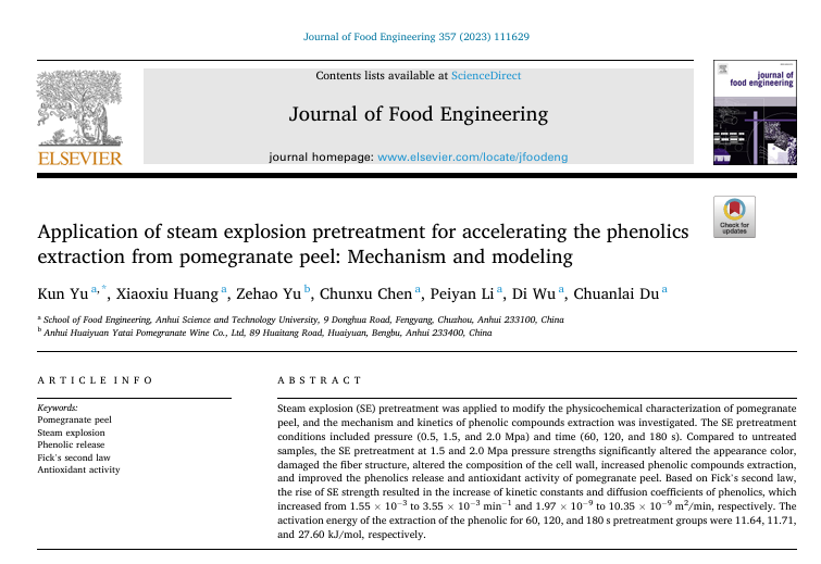 近日,ky开云官方网站_ky开云(中国)股份有限公司,食品工程学院与安徽怀远亚太石榴酒业有限公司联合团队在食品工程领域取得重要突破。研究发现,蒸汽爆破(Steam Explosion, SE)预处理技术可高效破坏石榴皮细胞壁结构,显著提升多酚类化合物的提取率及抗氧化活性,为石榴加工副产物的高值化利用提供了创新解决方案。相关成果发表于国际权威一区TOP期刊《Journal of Food Engineering》(2023年,第357卷)。