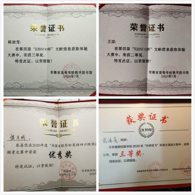 此外,在安徽省高等学校数字图书馆举办的“第四届‘EBSCO杯’文献信息获取体验大赛”中、 “安徽省银符杯英语四六级阅读理解模考大赛”中,我校学子也取得了良好的成绩。获奖名单如下: