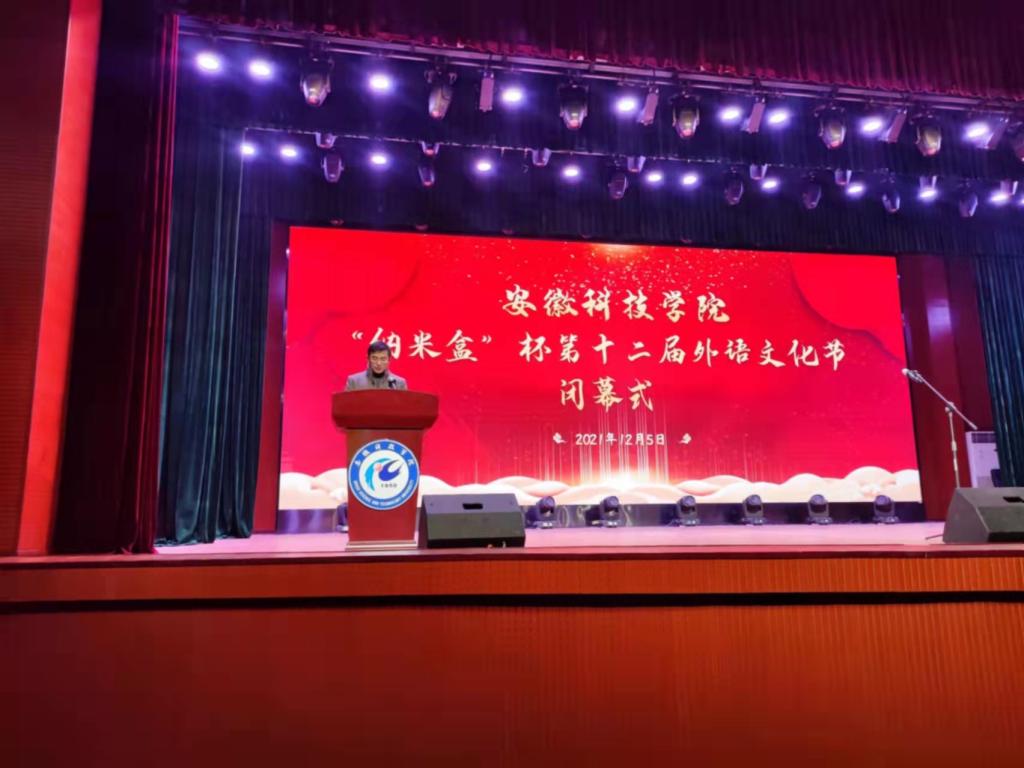 黄立义致闭幕词。他指出,第十二届外语文化节是在全校上下隆重庆祝党的百年华诞,全校师生落实学校第三次党代会确定的目标任务、推进“十四五”高质量发展的关键时期举办的。文化节做到了学术研究与竞赛活动相结合、文化引领与实践锻炼相结合、知识积累与能力提升相结合、线下策划开展与线上交流推介相结合,活动形式丰富、内涵深刻,参与度和知名度高,已成为学校知名文化品牌,他希望外语文化节再接再厉成为学校“三全育人”的重要载体和阵地,为学校坚持“五育并举”培养全面发展的高质量人才作出了积极的贡献。