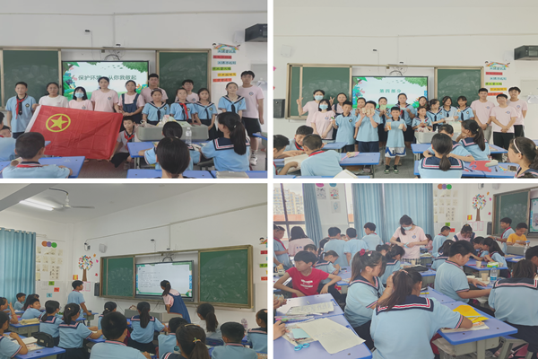 填写好调查问卷后,团队成员结合专业所学的知识给留守儿童们讲述保护环境的重要性以及如何保护环境,他们听讲时,坐姿端正,认真聆听。在面对环保小知识问答环节,他们积极参与活动,并踊跃回答问题,情绪异常高涨活跃。紧接着,团队成员发放工具,带着他们进行了变废为宝小游戏,让小朋友们亲手将废旧的物品变成可以利用的资源,刚开始,他们看着多媒体中变废为宝的成品,一脸迷茫,不知道从何处下手,团队成员就走到小朋友们面前给他们讲解,并亲自做示范,慢慢的,他们掌握了方法,并自己创新出许多新奇的小玩意。他们利用空瓶子,易拉罐,使用过的口罩、纸杯,瓶盖等生活中轻易可见的废品,集中智慧和各种创意,制作出了钟表、笔筒、飞机、小花等一些小玩具。团队成员审核孩子们的作品,不分优劣得对积极动手的孩子们提出表扬。活动临近尾声,团队成员给小朋友们发放各类学习用品,鼓励他们好好学习。