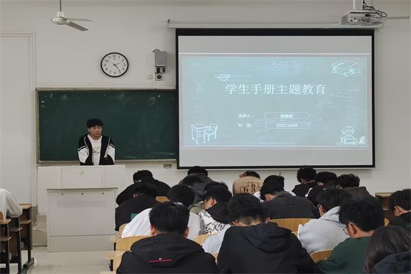 为加强新生校规校纪教育,提高新生自律意识和安全防范能力,10月4日至7日建筑学院分专业组织2022级新生集中学习《ky开云官方网站_ky开云(中国)股份有限公司,学生手册》,新生辅导员助理赵俊龙担任主讲。