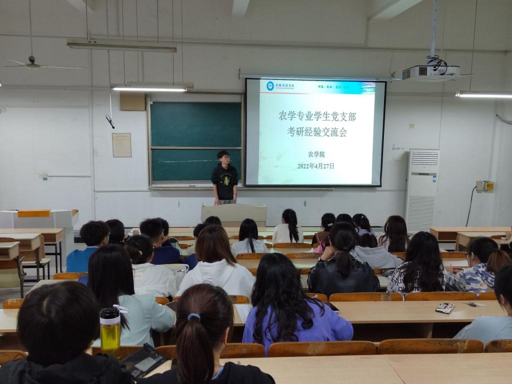 为进一步激发学生的考研热情,帮助学生了解当前考研形势,增强学生考研信心,明确考研目标,4月27日下午,农学专业学生党支部在求知楼A204举办考研经验交流会,本次交流会邀请了2018级农学专业9名考研成功的优秀学生代表进行经验分享,2019级农学专业和农学对口专业同学参加。活动由农学专业学生党支部书记薛晶晶主持。