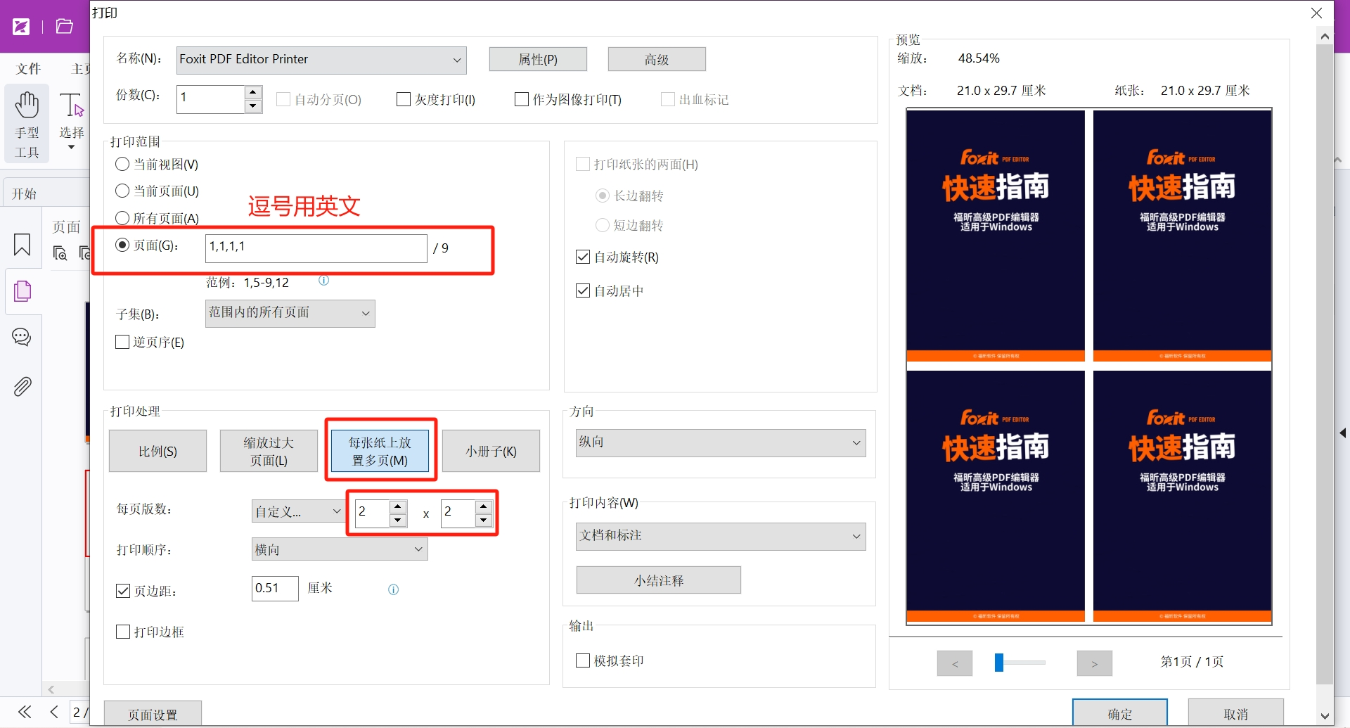 如果是需要打印 4 份第一页,在打印范围-页面这里我们需要填入:1,1,1,1 (注意逗号用英文格式),然后再调整每页版数即可。