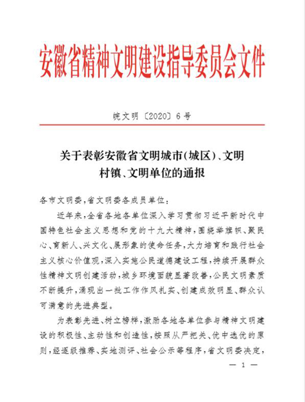 6月9日,安徽省精神文明建设指导委员会发布《关于表彰安徽省文明城市(城区)、文明村镇、文明单位的通报》(皖文明〔2020〕6号),我校榜上有名,喜获“第十二届安徽省文明单位”荣誉称号。这是我校首次获得省级精神文明创建成果。