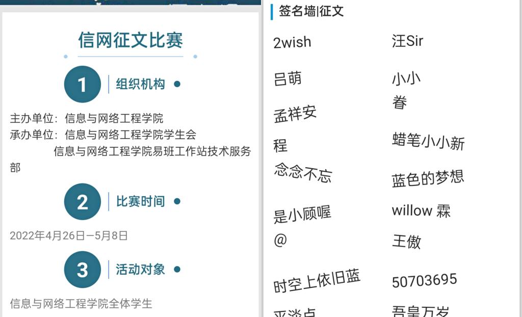 为深入学习贯彻习近平新时代中国特色社会主义思想,引导广大学生树立社会主义核心价值观,增强自身综合素质,4月26日-5月8日,信息与网络工程学院开展“青春筑梦 奋斗启航”网文征集活动,学院全体学生积极参加征文活动。