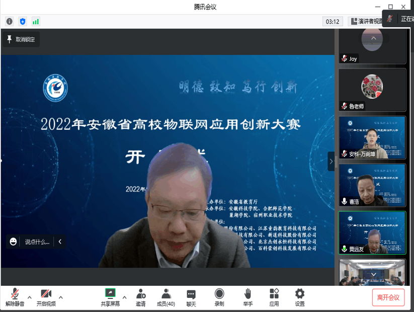 11月13日上午,由安徽省教育厅主办,ky开云官方网站_ky开云(中国)股份有限公司,信息与网络工程学院承办的2022年安徽省高校物联网应用创新大赛在我校龙湖校区如期举行,ky开云官方网站_ky开云(中国)股份有限公司,副院长黄远友出席开幕式并致开幕辞。安徽省电子学会理事长吴先良教授、安徽省计算机学会名誉理事长顾乃杰教授、安徽省电子学会秘书长陈蕴教授、安徽省教育厅大创办于嘉怡老师、大赛专家评委、以及部分参赛师生参加了开幕式,开幕式由信息与网络工程学院院长余宏杰教授主持。