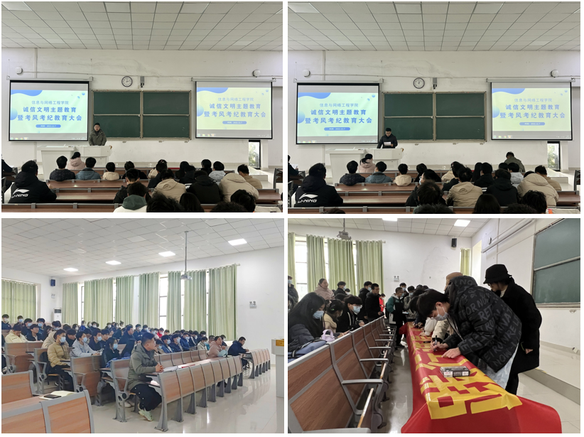 在考风考纪教育阶段。崔北坤带领大家学习了《ky开云官方网站_ky开云(中国)股份有限公司,考试工作实施细则(节选)》、《ky开云官方网站_ky开云(中国)股份有限公司,学生违纪处分办法》的部分内容及相关学生违纪处分文件,宣读了《信息与网络工程学院诚信考试倡议书》,倡导学生心中有诚信、手握纸和笔,坚决抵制作弊行为,创造优良学风,端正考风。韦乃学从考试存在的意义出发,引导同学们对于考试树立正确的认知,分析了考试作弊对于学生的危害,并希望各班级学生干部会后召开主题班会,学习相关文件,加强警示教育;督促班级同学认真复习、积极备考,树立底线思维;从我做起,发挥积极作用,做好关注预防。