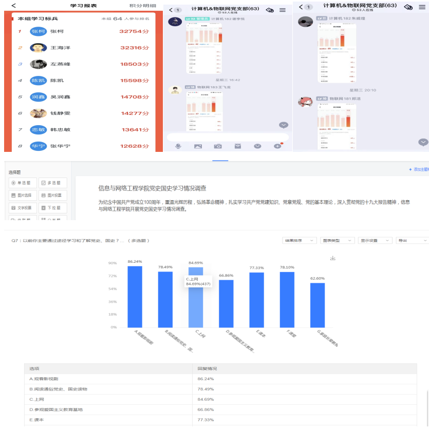 各学生党支部充分利用“学习强国”平台强大的学习功能,开展学生党史学习教育,敦促各支部学生党员加强自我学习,及时在党支部QQ群中分享优秀的党史学习教育资料。并在每周三党支部的线上学习交流时,定期发送“学习强国”学习周报,交流党史学习教育的心得感悟。