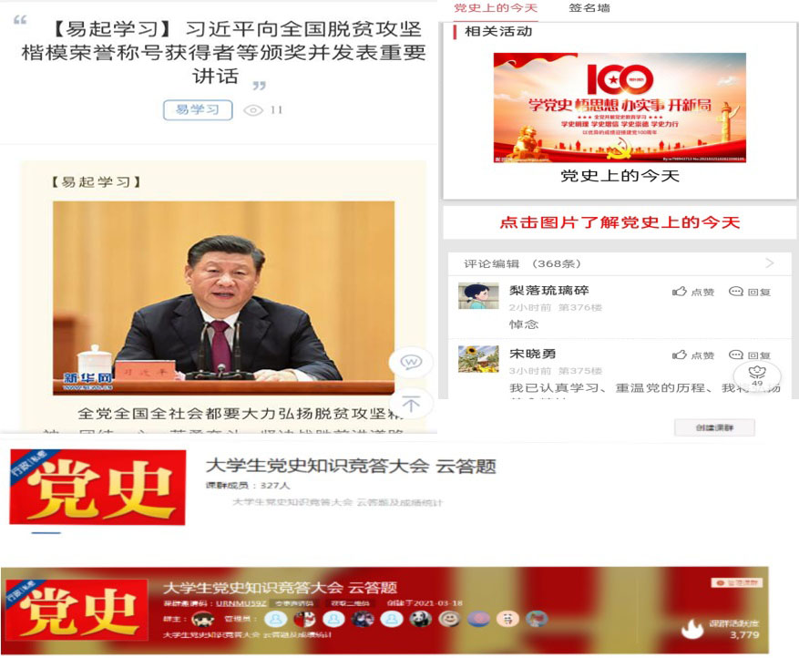 在易班平台学院主页上,推出《易起学习》栏目,自本学期第1周起,每周推荐1—3篇习近平总书记重要讲话,同时借助易班轻应用和易班优课两大应用模块,转载推荐《党史上的今天》及《大学生党史知识竞答大会》,加强党史学习教育宣传,丰富党史学习教育内容,同学们在学习后纷纷表示要弘扬与传承好优秀的革命精神,做一名讲好党史故事的传播者。