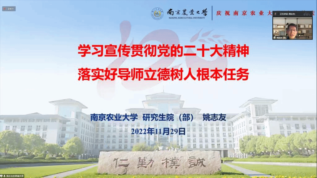 姚志友以《学习宣传贯彻党的二十大精神,落实好导师立德树人根本任务》为题,结合党的二十大精神,回顾分析了我国研究生教育的历史沿革,指出新中国成立70多年来,研究生培养水平不断提高,培养规模日益扩大,当前我国正从研究生教育大国向研究生教育强国迈进,总结得出高等农林教育是教育优先发展和农业农村优先发展的重要结合点。报告还系统梳理了南京农业大学研究生培养的实践探索,简要阐述了南京农业大学研究生教育发展理念的改革实践,交流分享了研究生思想政治教育的典型经验,为贯彻落实研究生导师立德树人职责提供了可供借鉴的路径探索。