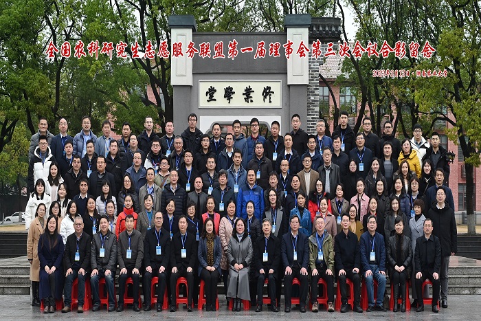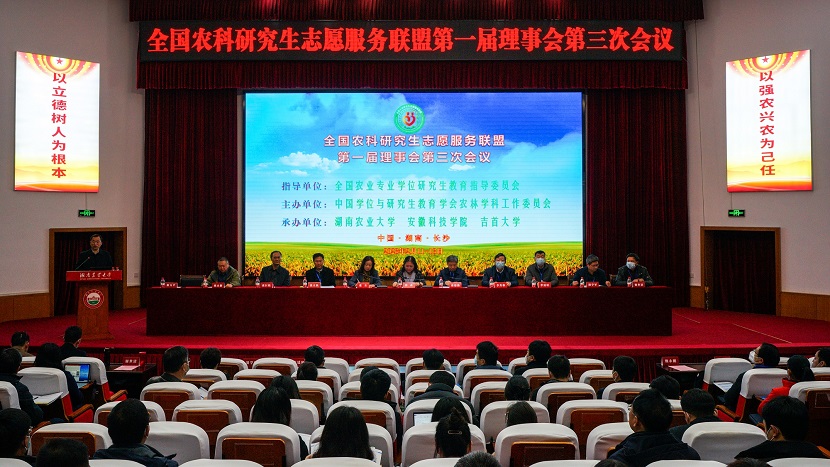 2月12日,由中国学位与研究生教育学会农林学科工作委员会主办,湖南农业大学、ky开云官方网站_ky开云(中国)股份有限公司,和吉首大学联合承办的全国农科研究生志愿服务联盟(以下简称“联盟”)第一届理事会第三次会议在湖南农业大学修业讲堂隆重召开。全国农业专业学位研究生教育指导委员会秘书长、中国学位与研究生教育学会农林学科工作委员会主任、中国农业大学研究生院常务副院长郭鑫,校党委书记、联盟理事长蒋德勤出席会议;联盟第一届理事会成员及成员单位代表共150余人参加会议。我校党委委员、副校长、联盟秘书长李升和,研究生处处长张春雨、副处长靳二辉参加会议。