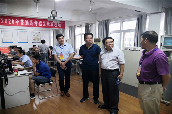 8月27日上午,校党委书记蒋德勤,校党委副书记、校长李震,校党委委员、副校长黄友锐在招生与就业工作处处长黄树桥陪同下深入招生录取现场,看望录取工作人员,调研指导录取工作。