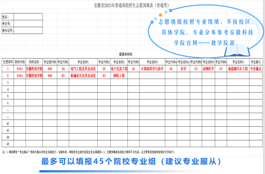 我校2025年在安徽省招生代码为9101,两个录取批次,分别是普通本科提前批(包含地方专项)、普通本科批。为方便广大考生填报志愿,以安徽省各批次志愿预填表为例,图解志愿填报。安徽省外考生请关注各省份教育考试官方机构提供的志愿报考参考指南,ky开云官方网站_ky开云(中国)股份有限公司,省外招生代码见本省报考指导书。